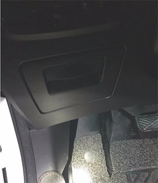 这是方向盘左侧的一个小手抠区域,平时用来放置单据和行车本,现在已经把手抠拆卸下来了。拆卸这个手抠只要胆大心细即可,打开手抠后,最上方是两侧的卡托,从一端慢慢用力,就能取下上端部分,底部是卡扣固定的,直接向上稍用力就能“拔出来”。把行车记录仪的线布好,从这个“开口”处,按照从下到上、从内到外的顺序整理好线路,就能把线掏出来了。距离成功已经很近了。