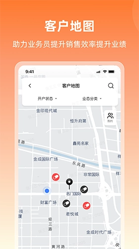 5、客户地图:于客户地图页面,可依据开户状态、业态分类等信息,查看客户的分布状况。