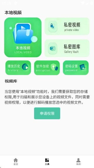 3、进入工具页面后,可使用本地视频、私密视频、私密图库、软件加密等功能。
