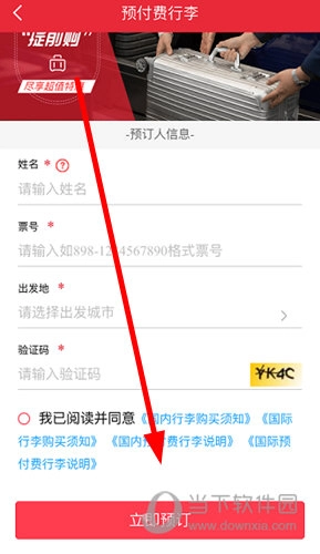 2、接下来输入准确的个人信息,勾选“我已阅读并同意”,再点击下方的“立即预定”按钮,就能完成行李额的购买操作了。