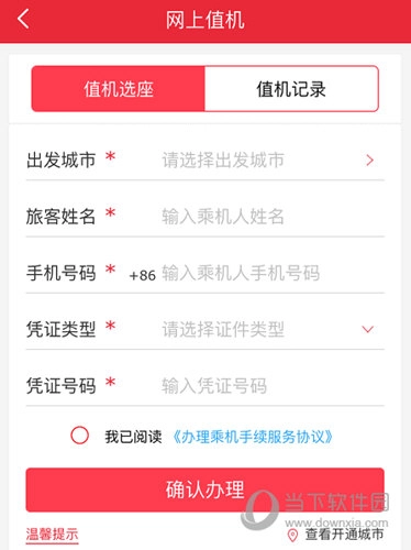 2、随后输入航班信息,点击下方的“确认办理”按钮就能开始选座了。