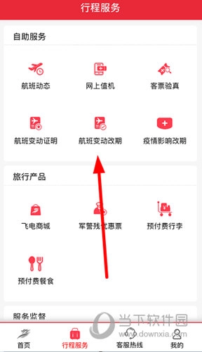 1、首先我们进入“行程服务”界面,接着在这个界面里点击“航班变动改期”选项。