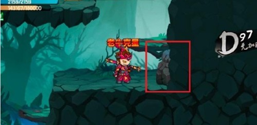 径直来到场景的最右侧,在此处能够向上跳跃。成功跳上去后,转身向左行进,会看到一个箱子。从第一个隐藏地点继续朝右走,在图示的地方会出现一块石头(我在图中已将这块石头打掉)。这块石头掉落下来,会砸破一堵石墙,进而开启隐藏场景。