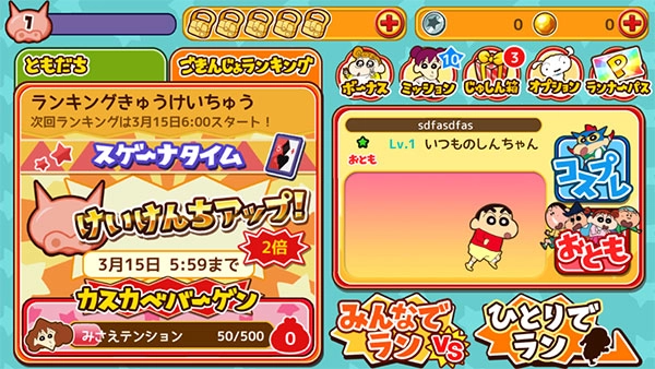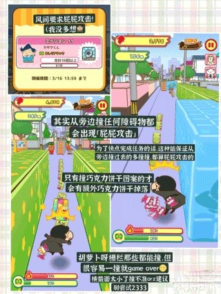 1. 把春日部当作跑酷的场地,在春日部的大街小巷中穿梭,尽可能多地收集巧克力饼干,争取拿到更高的分数。