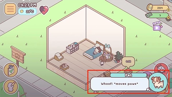 4、回到袖珍爱情游戏界面,点击宠物,这时能看到在右下角出现宠物的对话框,以上便是在袖珍爱情游戏里与宠物打招呼的方法。
