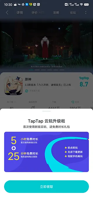 3、TapTap上现在是每天签到送15分钟,可以累积,它主要是它的周卡是9块钱比较便宜有时在节假日还会打折。画质以及帧数普普通通。