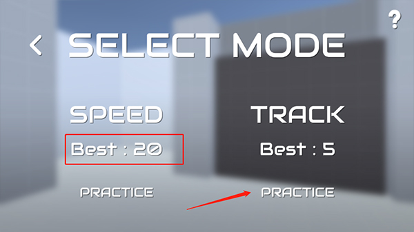 2、此处为模式选择区域。左边的“speed”代表速度,下方显示的是最好成绩。右边的“track”意为跟踪,其下方是跟踪的个数。点击最下方的“practice”即可开始游戏。