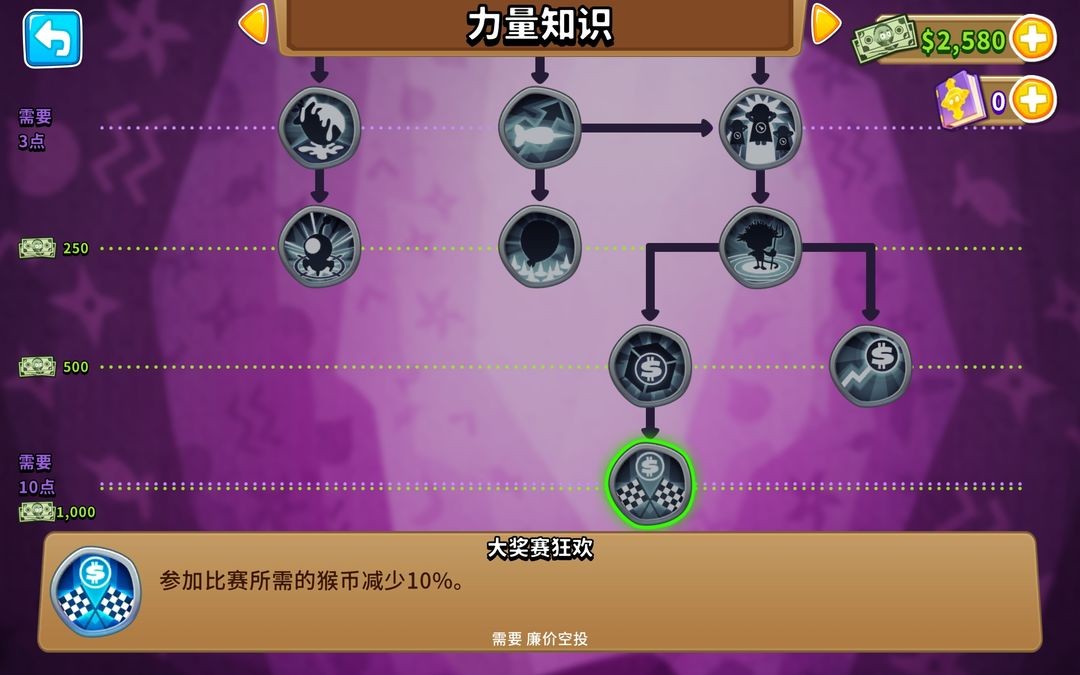 当拥有3个知识点时,应优先解锁【更多猴币】。猴币用途广泛,能够购买英雄、续关以及获取力量,而且在后期加点过程中,也需要耗费大量猴币。至于魔法猴的其他知识点,可根据个人喜好随意选择来点,或者在点出【更多猴币】之后,先着手去点其他类别的知识。