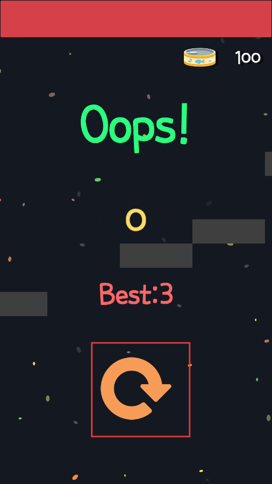 3、要是猫咪碰到障碍物,游戏就会显示“Oops”,这时点击重玩按钮,就能重新开启游戏,继续迎接挑战,努力取得更出色的成绩。