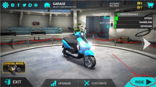 1. 当进入川崎h2摩托车驾驶模拟器的主界面时,点击位于右下方的“RIDE”。