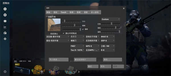 上方为设置准星,下方从左至右,第一个是匪的设置,第二个是警的设置。之后便是刀的设置。再往后是手套设置,接着第一个选项是选择使用A1还是A4,然后是选择使用USP还是P2000,后续大家可自行设置,在此就不详细介绍了。