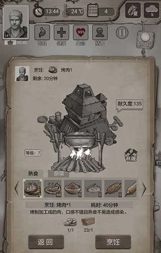 10、回到家后,要是浆果吃完了,那就做些烤肉。烤肉能够以较低成本将不能食用的生肉转化为可吃的食物,在解锁相关科技前,比那些耗费双份木材的烤素食强太多了。