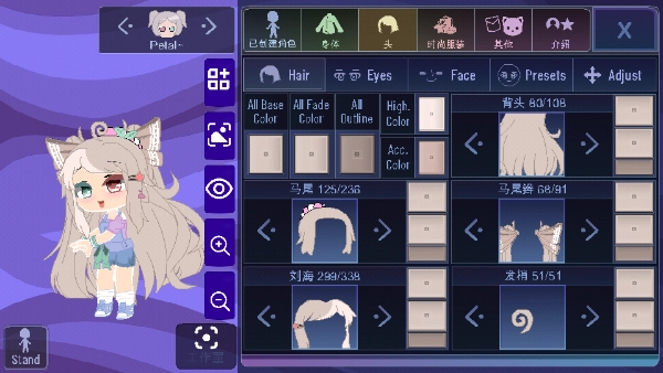 6、再看看头发部分,你能够为头发设定各式各样不同的颜色,也能打造出别具一格的发型。具体而言,马尾造型有236种选择,马尾辫有91种,而刘海的选择更是多达338种,至于其他发型选项就更丰富了。