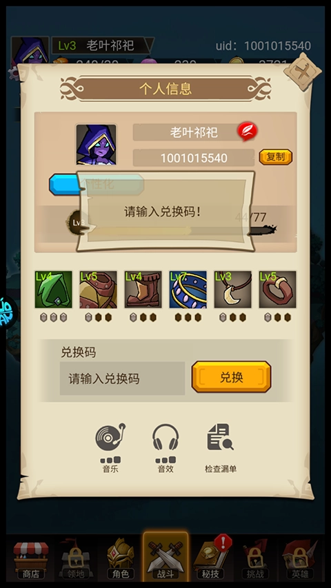 2、然后在弹出的界面输入兑换码(兑换码需要通过第五关才可以开启兑换)