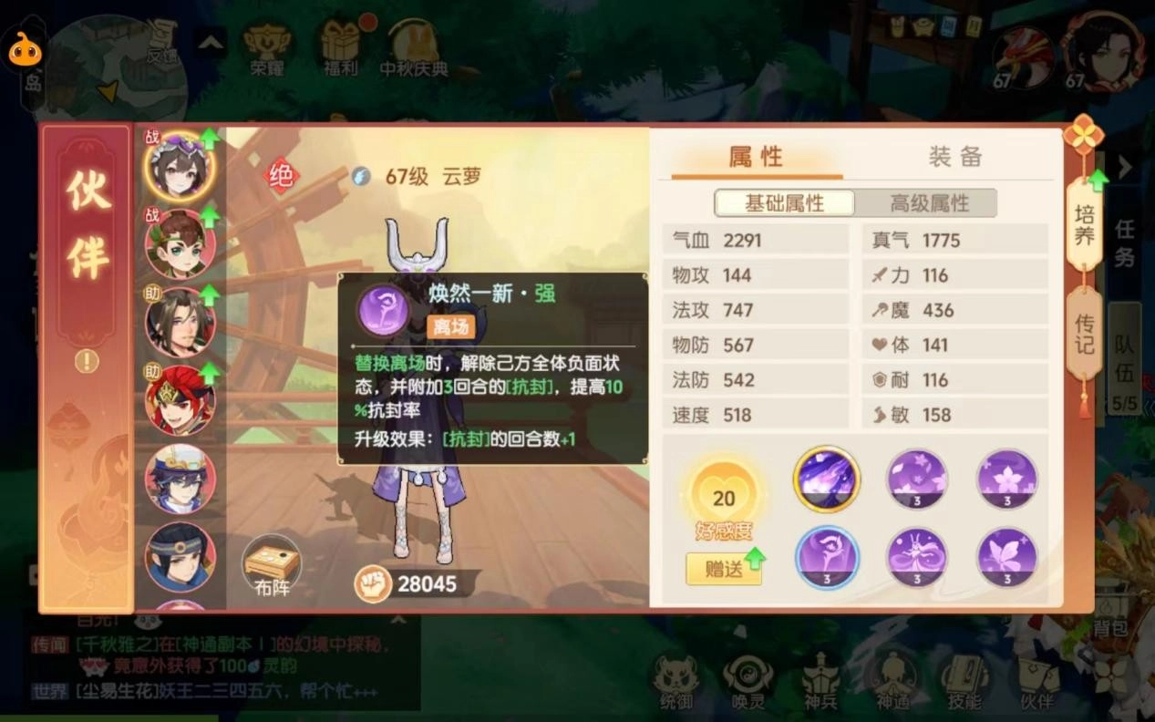 例如云萝罗的被动“焕然一新”:替换立场时,解除己方全体负面状态,并附加3回合的[抗封],提高10%抗封率,此为离场技能;