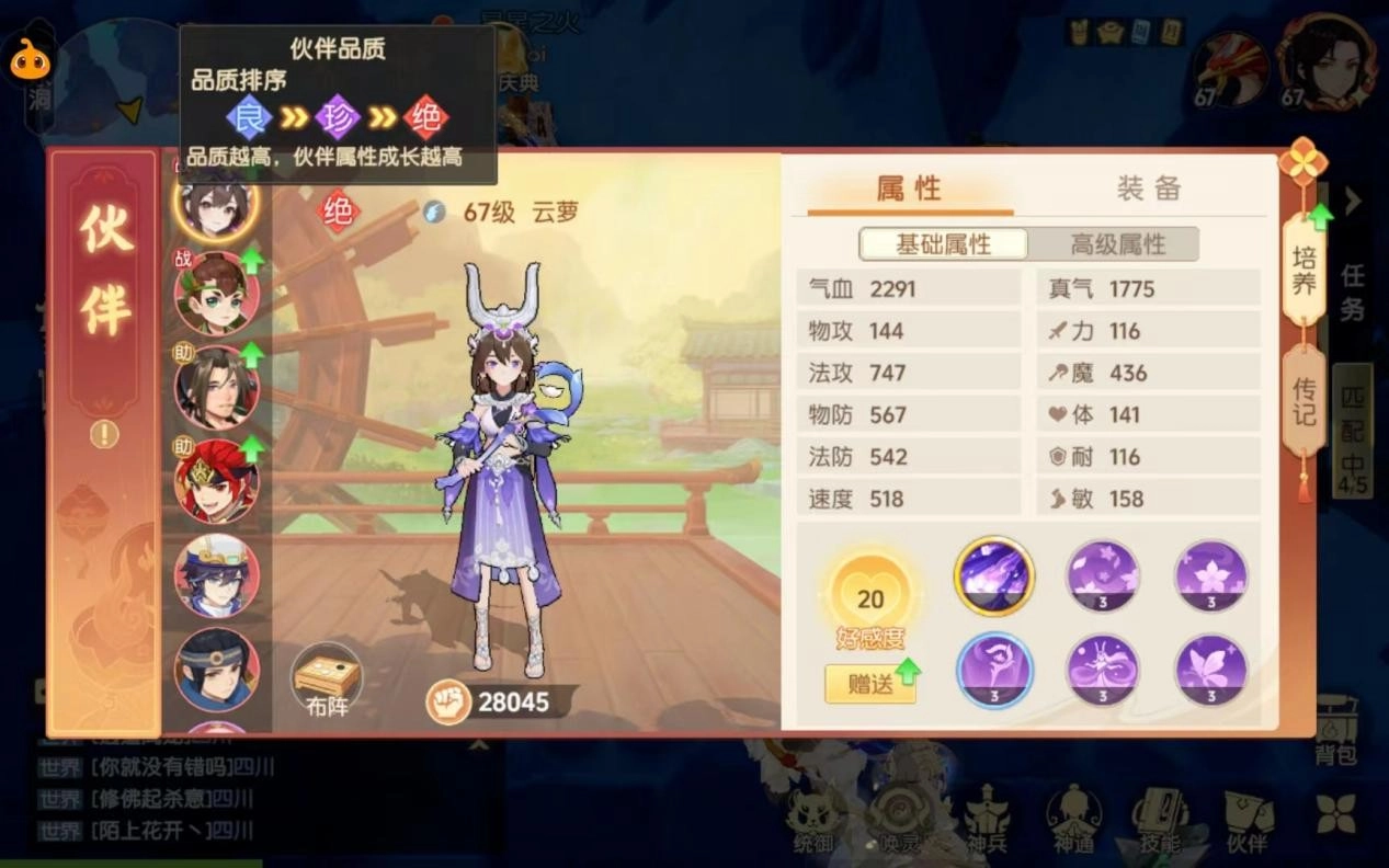 伙伴和人物一样,有基础属性、附加属性和高级属性,基础属性和高级属性,主要是由伙伴天赋和装备带来的,基础属性是伙伴的天赋(攻击防御速度等),装备提供了伙伴的附加属性(属性点)和高级属性(封印命中暴击率等),附加属性会加到伙伴的基础属性上。