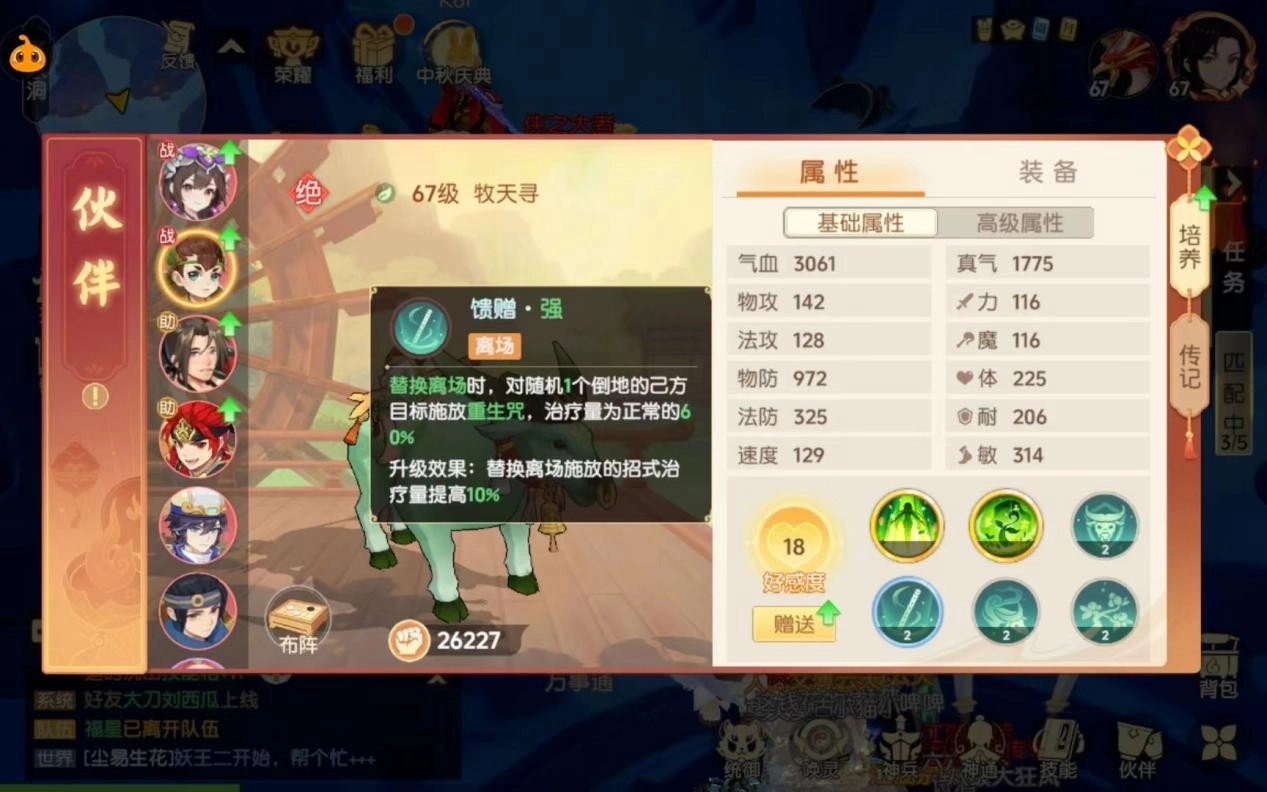 除了装备提升属性外,玩家给伙伴喂食青丘白菜和神木佛跳墙提升好感度,也可以给伙伴基础属性提供一定的加成。