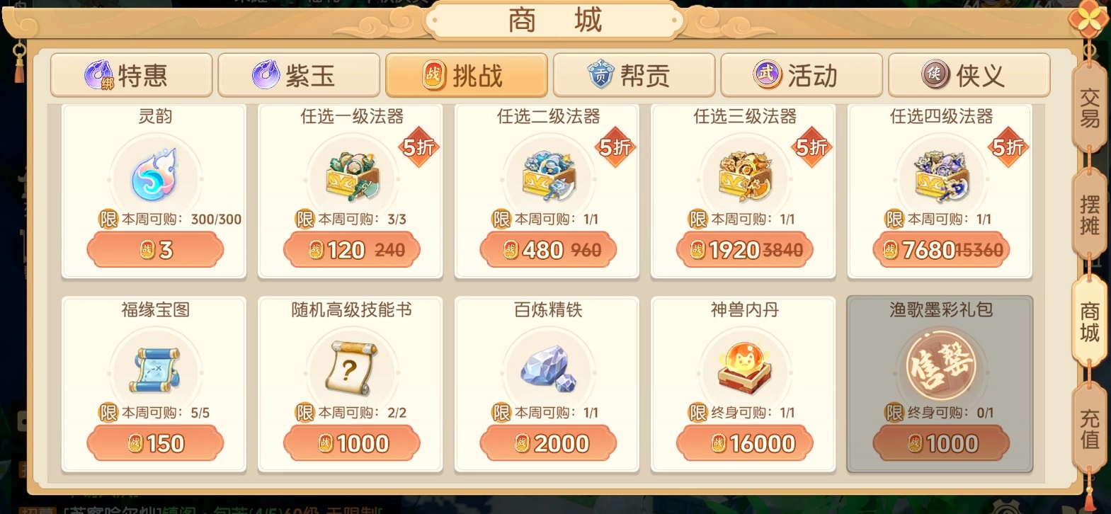 活动积分主要有以下4种,分别是挑战积分、帮贡、活动积分、狭义积分。