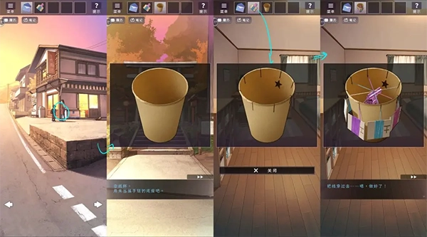 在街道与弟弟对话得到苦茶,将苦茶给幽灵得到空杯子,空杯子在书桌前使用得到剪好的纸杯,纸杯与线轴组合得到编织工具。