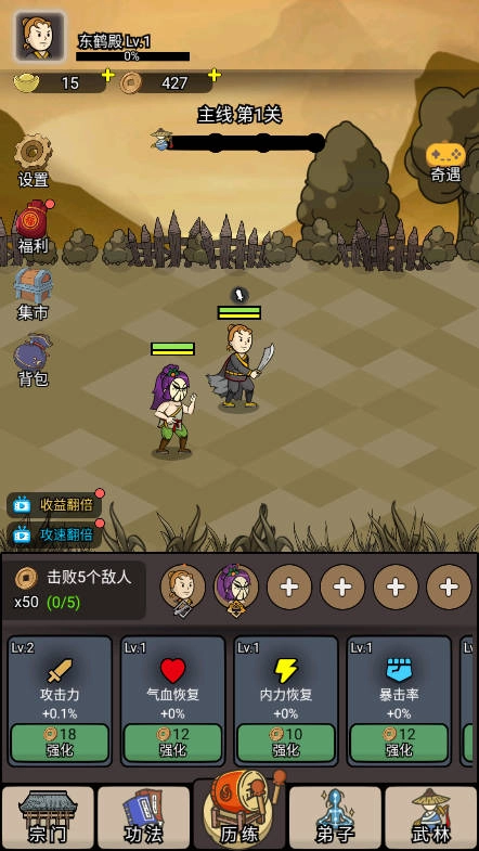 4、前期在满足任务要求的基础上,尽量将收益属性面板拉满,这样推图掉落的铜钱会非常多。有了足够的资金,就能用来升级弟子,进而大幅提升推图速度。