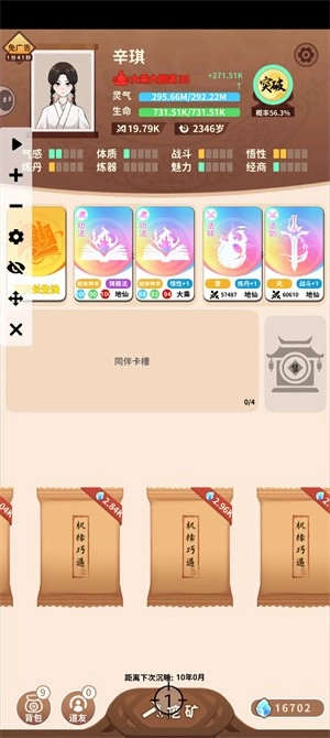 2、灵石不要用掉,一直挖矿,大概每是你十年有一次宝阁拍卖,可以买功法,挑枯木逢春、大恢复术、恢复术。新手搭配一个枯木,一个恢复/大恢复就可以,后期买丹药,大概一个小时就能完成第一次地仙。