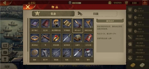2、军事地图:这是极为强大且性价比超高的装备。在前期,可依据实际情况,为诸如斯巴达克斯、维钦托利这类移动速度较慢的将领购置该装备。