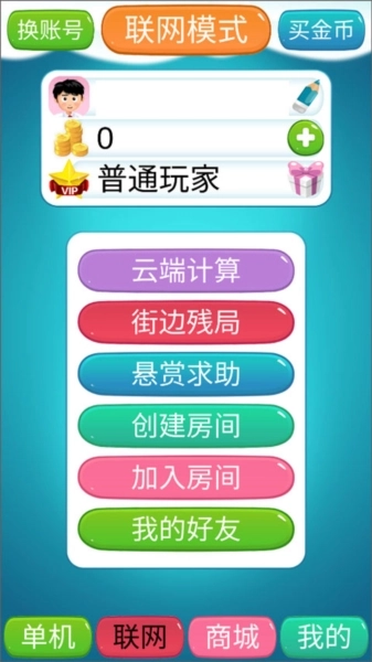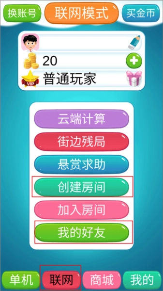 1. 开启游戏,首先执行实名认证操作,认证通过后进入游戏主界面。该游戏总共划分成四个板块:单机、联网、商城以及我的。在“联网”页面里,能够看到云端计算、街边残局、悬赏求助、创建房间、加入房间以及我的好友,此时先点击我的好友。