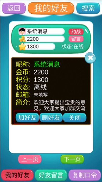 3、点击其中一位棋友,页面会显示加好友、删好友和关闭这三个按钮。点击加好友按钮后,你会发现已成功添加该棋友为好友。