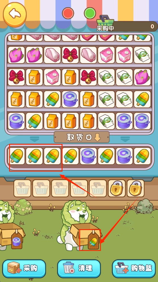 2、把与小狗采购框内物品一致的东西,从取货口装入小狗的采购框。
