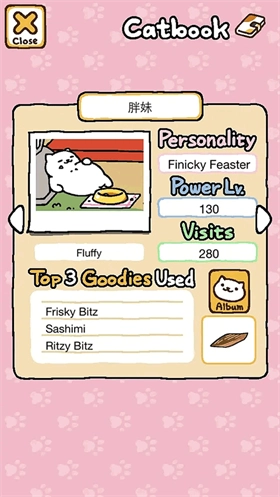 3、贪吃猫:胖妹。她总是把猫粮一扫而光,虽然已经在场景里的猫不会被她马上赶跑,但是没有猫粮就招不来新的猫。如果你急急地在胖妹还在饭后养神时就把猫粮添满,就会把胖妹马上赶跑。把正在玩耍的猫咪赶跑不是好事。