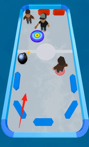1. 场景与道具设定在冰球桌形状的场地中,场内放置着炸弹、棒球棍等道具。玩家的目标是推动飞盘(呈现为彩色圆盘),同时要躲避对手(以卡通角色形象出现)。
