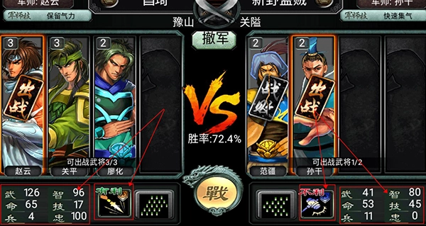 选择武将出战顺序很重要,出征前补满生命值、技能值和士兵数,带不同兵种的武将,首选克制敌军的兵种出战,已方高级武将留在关键时刻对战敌方高级将领。