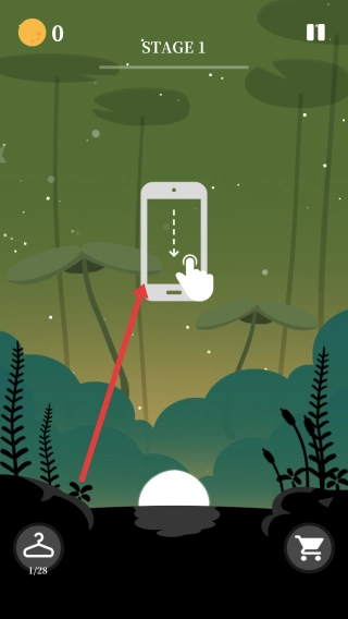 2、依照操作指引,于屏幕处向下滑动,蓄力完毕后松开,使青蛙跳跃起来,越过障碍,熟悉游戏玩法。