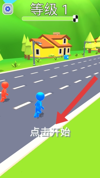 1. 页面显示等级为1,呈现蓝色、红色小人角色以及道路、房屋等场景元素,此页面属于游戏开始前的引导界面,点击“开始”按钮即可进入游戏关卡。