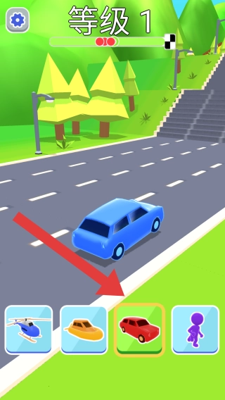 2、载具选择栏位于下方,其中包含直升机、船、红色汽车、人形角色等可供选择的对象,此界面用于载具的选择或切换,玩家点击即可选中红色汽车等载具参与。