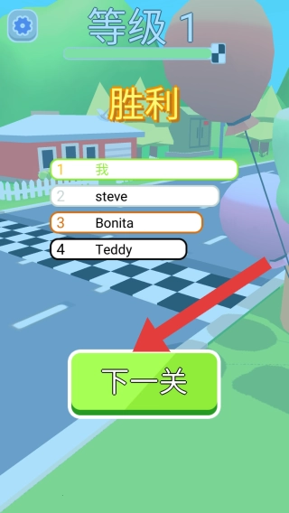 3、排名表明玩家我位居第一名,点击“下一关”按钮,此操作属于关卡结束后进入下一关引导页面的步骤。