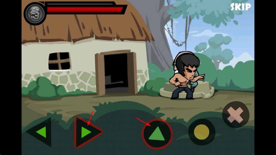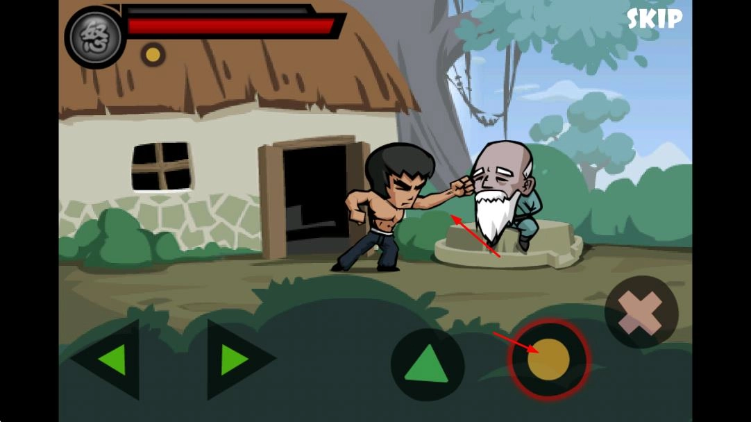 1、进入游戏后,在角色界面选择初始功夫招式,通过虚拟按键组合释放基础拳腿攻击,完成新手教程的基础格斗训练。
