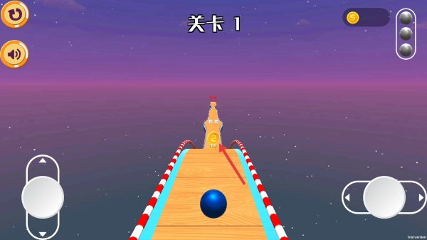 2、于【关卡1】场景之中,借助左右两侧的虚拟按键,操控蓝色球球顺着木质赛道滚动,对准路径上的金币,稳健地向前行进。