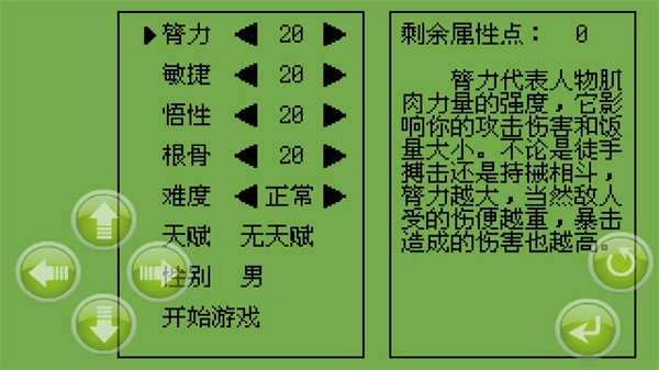 3、在此处,玩家能够对人物的臂力、敏捷、悟性、根骨等属性进行点数分配,完成后点击“开始游戏”。