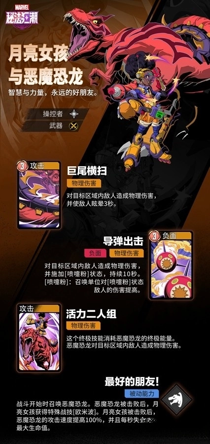 月亮女孩,这位年仅13岁的天才少女,凭借着非凡的创造力以及所发明的高科技装备,在漫威宇宙中崭露头角,成为新一代英雄。在她身旁,有一头红色巨兽——恶魔恐龙,它拥有惊人的力量与智慧,是月亮女孩最忠实的搭档。