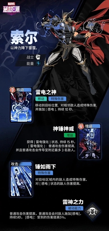 索尔发动攻击时,会附带雷电伤害。他还能借助雷电之力,强化自身战斗力。伴随着万钧雷霆,强大的雷神之锤携他降临战场,将处于感电状态的敌人们逐个击破!