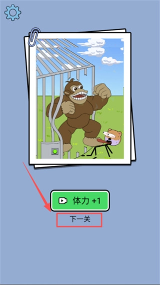 2、当看到大猩猩的照片以及那个橙色头发的人时,倘若感觉体力不足,就点击绿色的体力加1按钮,为自己补充些体力。要是觉得体力还可以,那就直接点击红色框框中的下一关按钮,继续进行游戏。