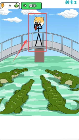 3、进入关卡2的水域场景后,首先留意左上角显示的9点体力值,接着借助绿色提示按钮,助力火柴人安全通过那座有鳄鱼的拱桥。
