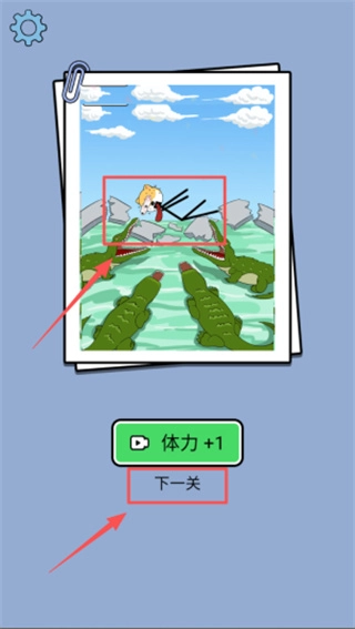 4、倘若遭遇鳄鱼威胁,依照红色方框与箭头的指示操控卡通角色,以躲避危险。待处于安全状态后,点击“下一关”按钮,进入后续内容。