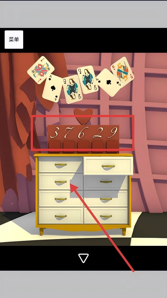 2. 重点关注标有数字37629的柜子,试着点击其抽屉,同时留意周边的扑克牌元素,探寻抽屉内隐藏的线索。