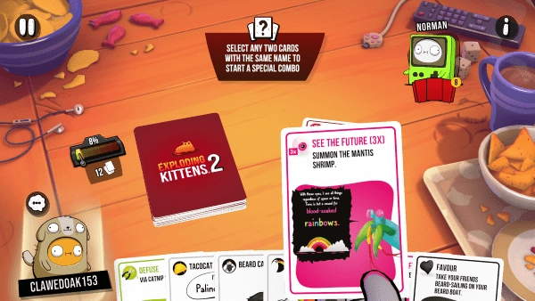 游戏画面采用可爱的卡通画风,卡牌的动画效果十分生动,操作也极为简单,轻松上手,适合各个年龄段的玩家。每回合,玩家都要从牌堆里抽取一张卡牌,如果抽到“爆炸猫”卡牌,且手中没有“拆弹卡”,就会立刻出局。所以玩家需要巧妙运用策略,尽量避免抽到“爆炸猫”,或者在抽到后借助“拆弹卡”来化解危机,最终成为唯一的幸存者。