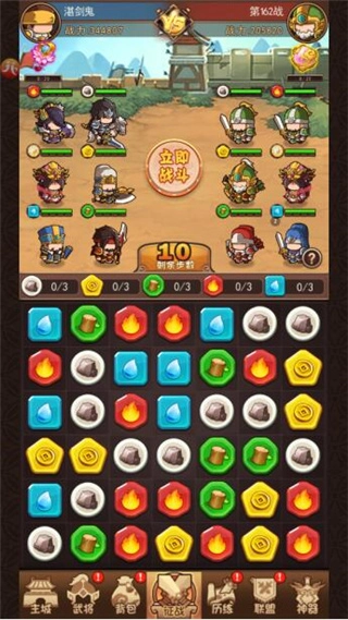 在PVE战斗环节增添独具特色的三消玩法,采用战前操作的形式,每个色块分别对应武将所处的位置(金、木、水、火、土、阵眼)