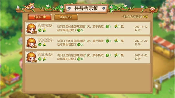 在农场的公告栏处,能够查看农场订单任务以及访客记录。玩家每日会随机得到一定数量的农场任务。要是对当下的订单不太满意,可试着点击右上角的刷新按钮,刷新任务内容,从而获取相对轻松的任务。当提交农场里的农作物完成这些订单后,便可获得农场经验用以升级农场。