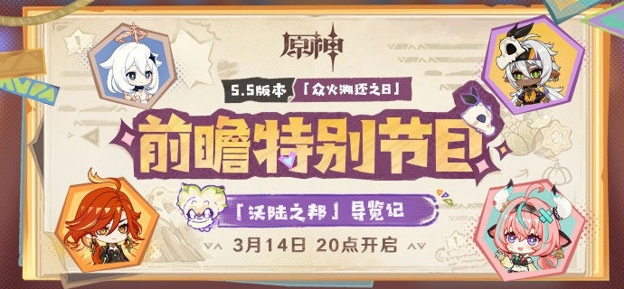 1注意啦!《原神》5.5版本前瞻直播将于3月14日今晚20点准时开播!各位旅行者要是想观看直播,记得提前守好直播间哦~