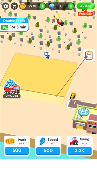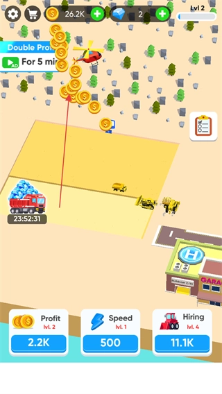 3、凭借获取到的金币,点击下方的“Hiring”按钮,招募更多如推土机之类的设备,以此提高挖掘效率。